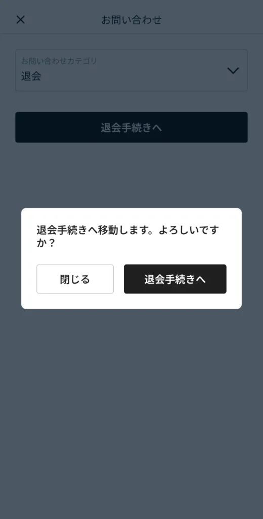 「お問い合わせへ」に飛ぶと、お問い合わせカテゴリが「年齢確認について」「お支払について」など9つ項目が出てきます。そこの1番下の「退会」を選択し、「退会手続き」へをクリック。